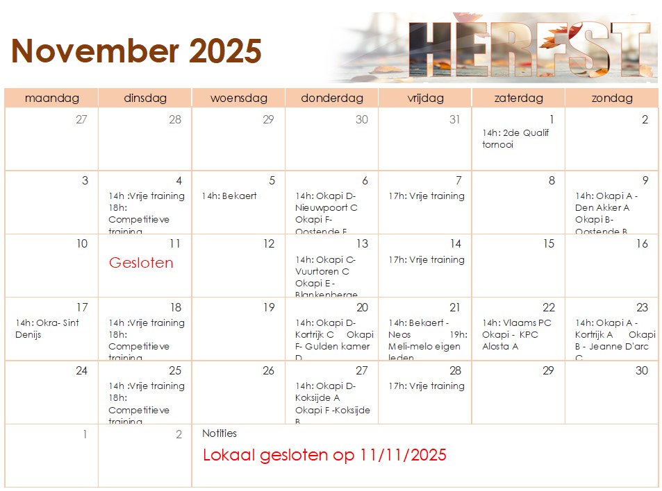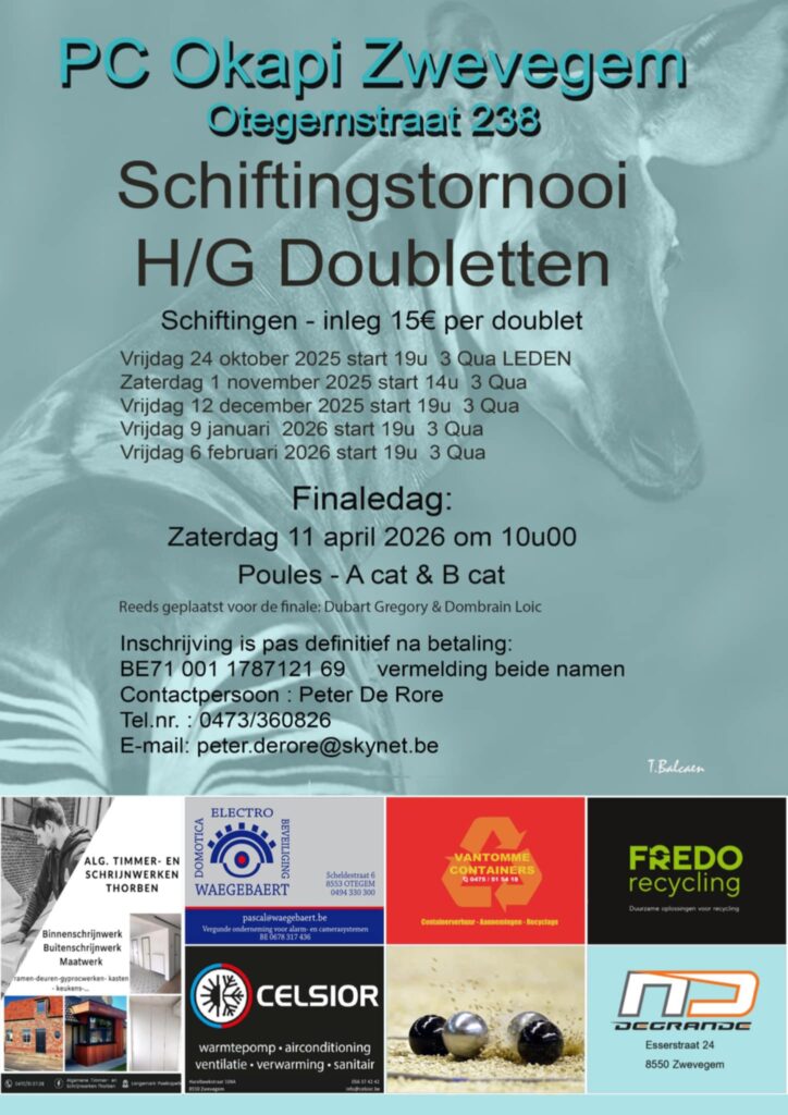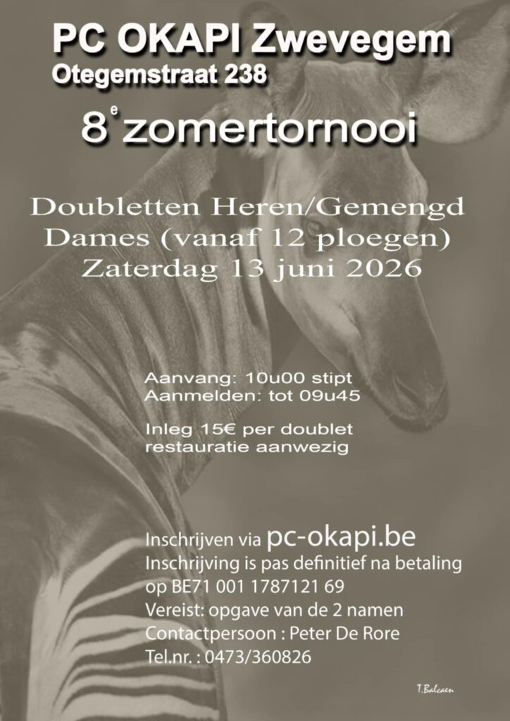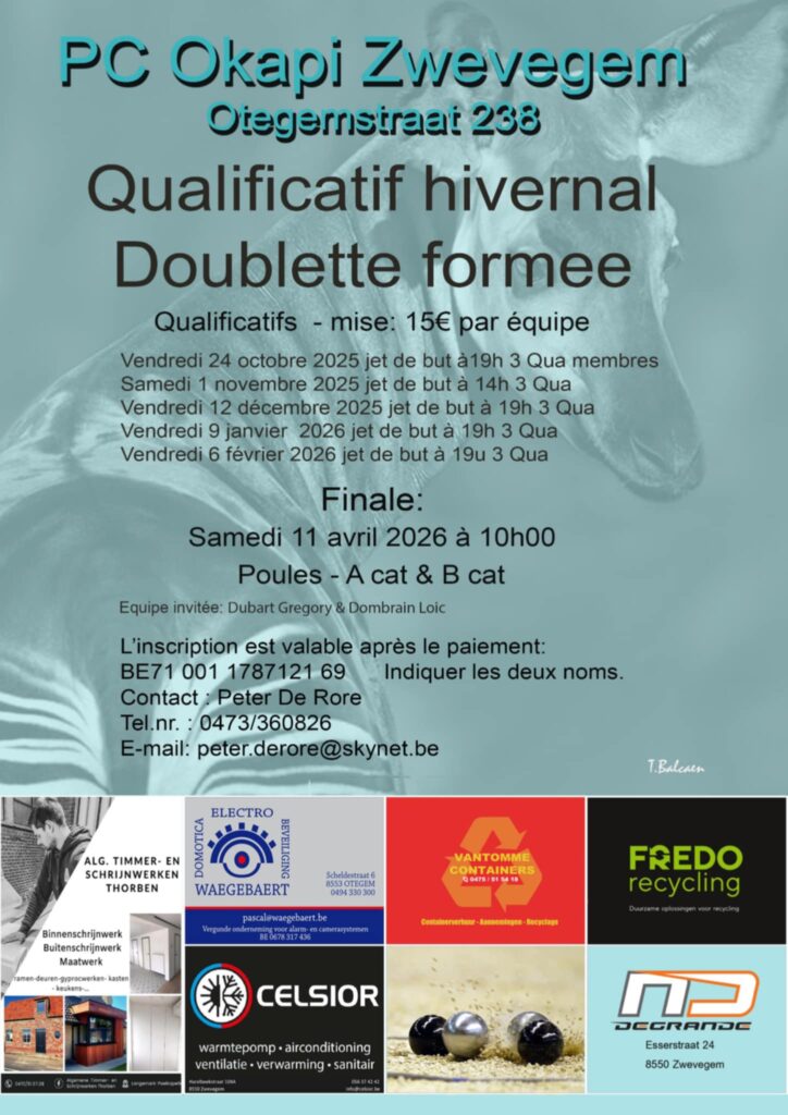 Bienvenue sur le site du Pc Okapi Zwevegem Cliquez ici pour vous inscrire au concours triplette du 14 mars 2026 Cliquez ici pour vous inscrire au concours doublette du 13 juin 2026 Les rencontres du jeudi 20/11 seront jouées le jeudi 18/12 /2025 CALENDRIER DES ACTIVITES MENSUELLES DU CLUB Facebook Twitter Youtube Lien Menu Accueil Inscriptions Contact